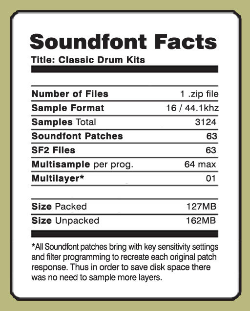 This collection includes a quality set of 63 Drum Kits software or hardware device capable to load Soundfonts. The audio quality is 16-bit / Stereo. The sampled instruments are classic drum machines and several synthesizer drum kits. Many of the kits are General Midi compatible. Note that these are single sample drum and percussion sounds, not actual rhythmicloops.